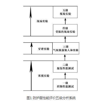防化服的性能評(píng)價(jià)主要包含防護(hù)性能以及舒適性2個(gè)方面。目前成熟的評(píng)價(jià)體系是五級(jí)分析系統(tǒng),如圖1所示。可以劃分為客觀評(píng)價(jià)、人體穿著實(shí)驗(yàn)以及現(xiàn)場(chǎng)實(shí)驗(yàn)3個(gè)層次。