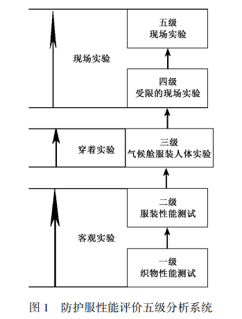 防化服的性能評價主要包含防護(hù)性能以及舒適性2個方面。 目前成熟的評價體系是五級分析系統(tǒng),如圖1所示。可以劃分為客觀評價、人體穿著實驗以及現(xiàn)場實驗3個層次。
