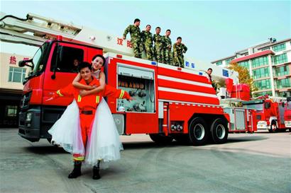 身著消防服和穿著潔白婚紗的一對新人以登高車、訓(xùn)練塔、搜救犬等為背景,那些曾經(jīng)號稱時尚、古典、樸素、奢華的最美婚紗照們,在這一刻被徹底的秒殺了,就是依靠這些簡單元素使一對新人一下子“火”了。