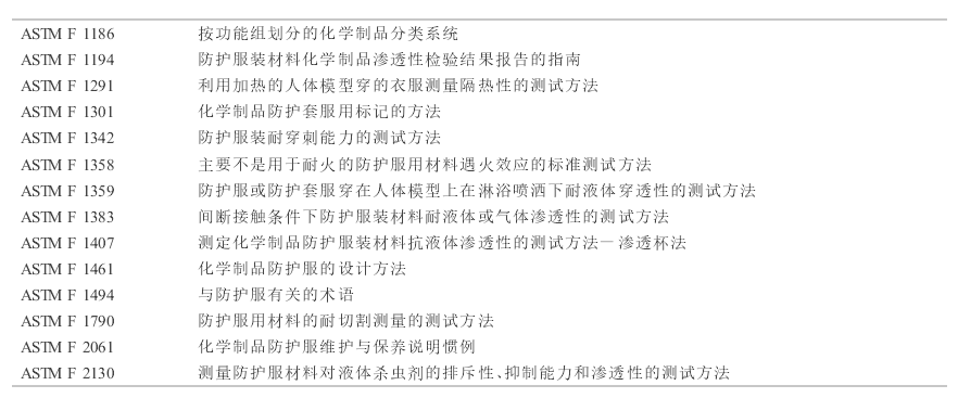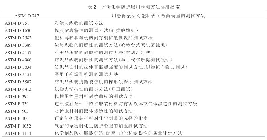 (3)在ASTMF 1296- 2003《化學(xué)防護服評價用標(biāo)準(zhǔn)指南》中提出評價化學(xué)防護服材料耐化學(xué)性能,材料物理性能,縫合與閉合性能,以及全面服裝性能所用檢測方法標(biāo)準(zhǔn)的指南(見表2),并對標(biāo)準(zhǔn)的使用做出了具體建議。