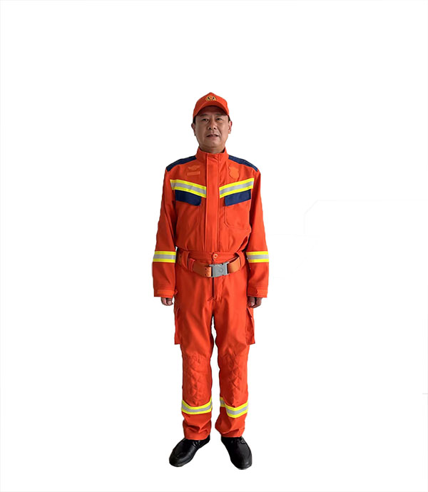 ●消防員滅火防護(hù)服為分體式,下褲為背帶式。